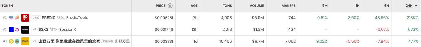 가장 크게 오른 거래쌍은 PREDIC/SOL (PREDIC)이다. 24시간 기준 21만3000% 급등했으며 가격은 0.006251달러를 기록했다. 이어 $SXS/ETH (SessionX)는 673% 상승하며 0.001746달러에 거래됐고, 山野万里/WBNB (山野万里)는 477% 오르며 0.003831달러를 나타냈다.
