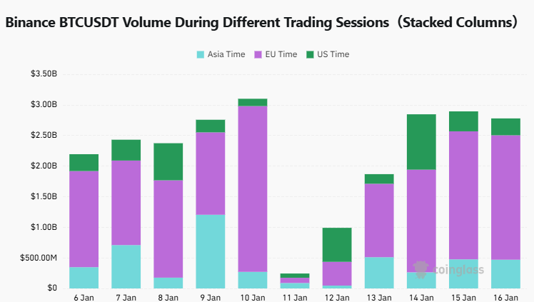 바이낸스 BTCUSDT 거래량은 아시아 시간대 4억6981만 달러, 유럽 시간대 20억3000만 달러, 미국 시간대 2억7572만 달러로 집계됐다.