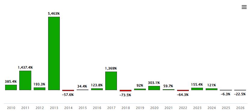 스탯뮤즈에 따르면 최근 연간 수익률은 ▲2022년 –64.3% ▲2023년 155.4% ▲2024년 121% ▲2025년 -6.3%로 집계됐다. 2026년 연초 대비 수익률은 전주 -14.5%에서 -22.5%로