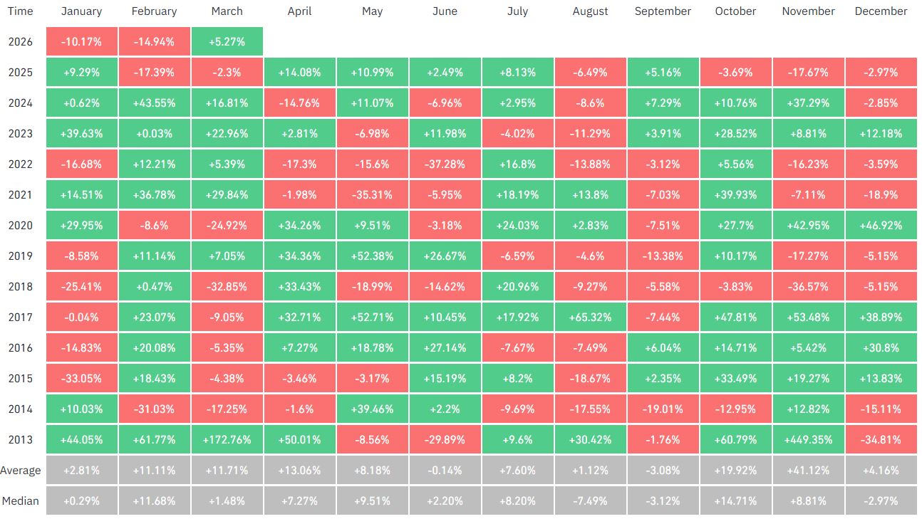 이달 누적 기준 비트코인은 5.27%의 월간 수익률을 기록 중이다. 전주 11.22% 대비 상승폭 일부를 반납한 상태다. 3월 평균 수익률 11.71%에는 못 미치지만, 중앙값 1.48%를 상회하며 양호한 흐름을 유지하고 있다. 3월은 과거 13번 중 7번 하락 마감한 바 있다.