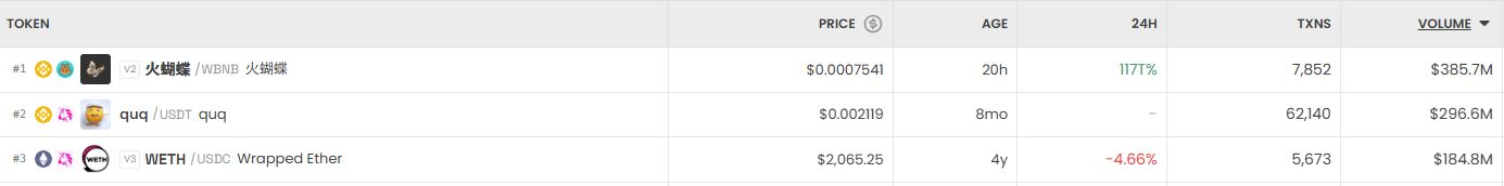 가장 크게 오른 거래쌍은 화호접(火蝴蝶/WBNB)으로 24시간 기준 1171% 상승했다. 이어 쿼크(quq/USDT)는 변동 없이 보합을 나타냈고, 롱기누스(LGNS/DAI)는 0.55% 상승했다.