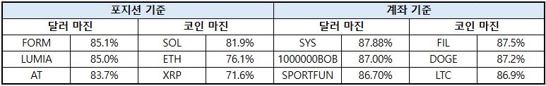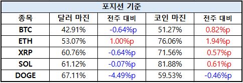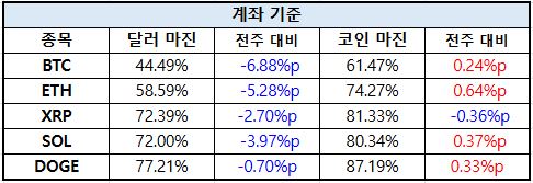 계좌 기준에서도 롱 중심 구조는 유지됐지만, 전반적으로는 비중 축소 흐름이 두드러졌다. ETH는 달러 마진 기준 -5.28%p 하락했음에도 코인 마진에서는 74.27%로 여전히 높은 수준을 유지했다. XRP는 달러 마진 기준 72.39%로 높은 롱 비중을 보이면서도 코인 마진에서는 소폭 감소해 투자자 간 방향성 차이를 나타냈다. SOL 역시 달러 마진에서 -3.97%p 하락했지만 코인 마진에서는 증가하며 레버리지 포지션과 현물 기반 포지션 간 괴리가 확인됐다.