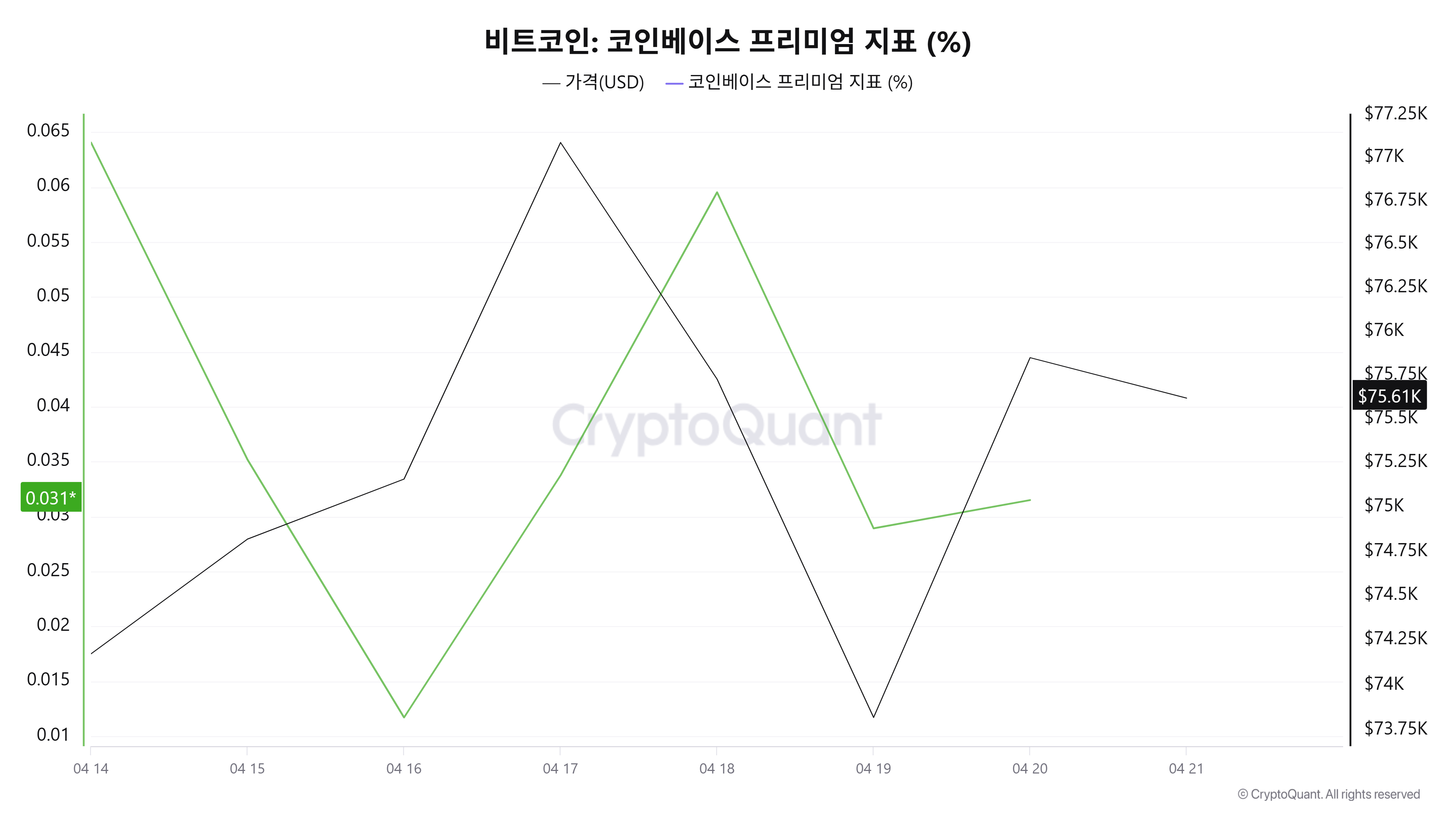 코인베이스 프리미엄 지표는 0.0315를 기록했다.