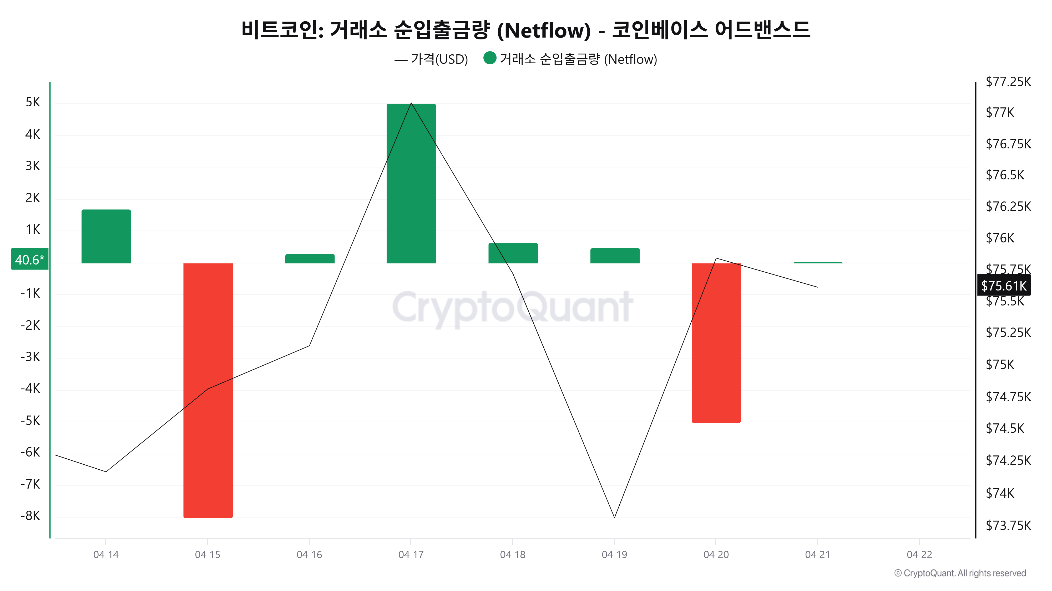 크립토퀀트 데이터에 따르면 4월 21일(UTC 기준, 미완결) 코인베이스 어드밴스드 기준 비트코인 순입출금은 40BTC로 집계됐다. 코인베이스는 기관 비중이 높은 거래소로, 순유입은 통상 매수 대기 자금 혹은 포지션 강화로 해석되는데 전일(-5005BTC) 대규모 순유출 이후 유입으로 전환된 모습이다.