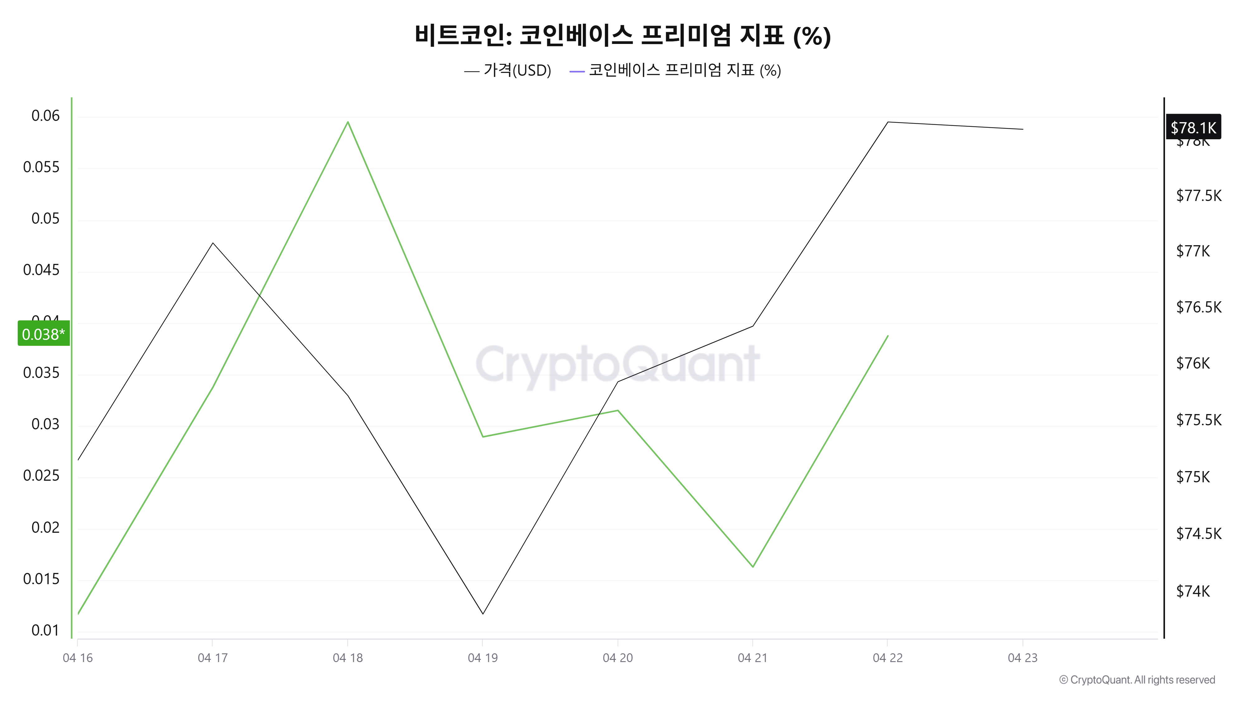 코인베이스 프리미엄 지표는 0.0387을 기록했다.
