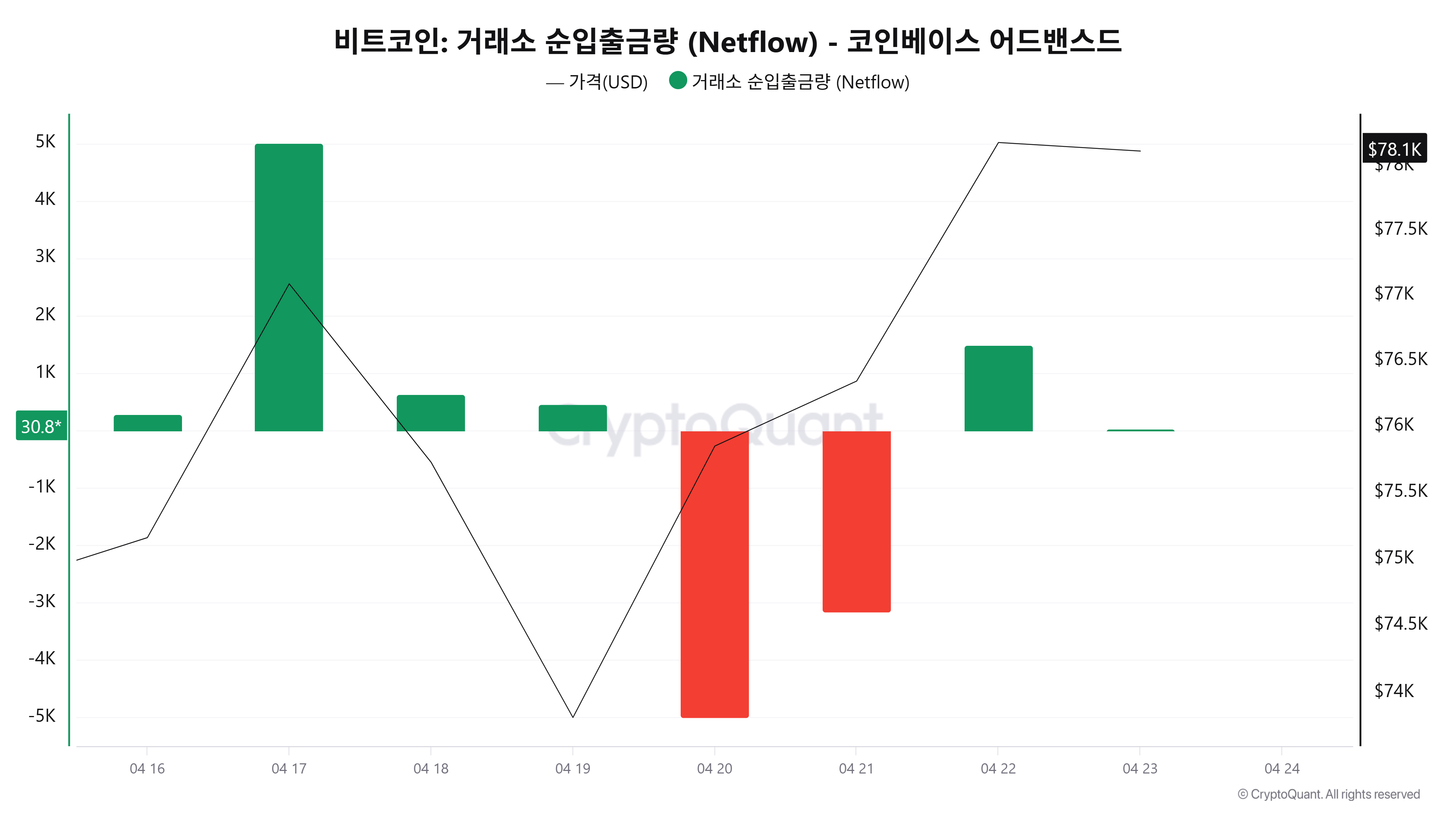 크립토퀀트 데이터에 따르면 4월 23일(UTC 기준, 미완결) 코인베이스 어드밴스드 기준 비트코인 순입출금은 30BTC로 집계됐다. 코인베이스는 기관 비중이 높은 거래소로, 순유입은 통상 매수 대기 자금 혹은 포지션 강화로 해석되는데 전일(+1492BTC) 유입 이후 소규모 유입이 이어진 모습이다.