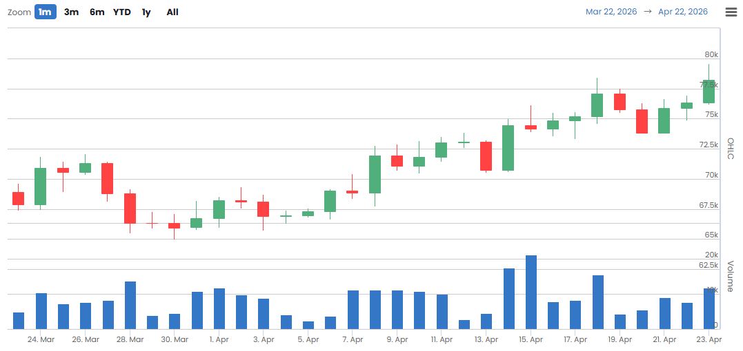 앞서 4월 19일(+465BTC), 20일(-5005BTC), 21일(-3154BTC), 22일(+1492BTC)에 이어 4월 23일(+30BTC, 미완결)로 나타나며 변동성 높은 수급 흐름이 확인된다. 최근에는 대규모 유출 이후 유입 전환이 나타나는 등 기관 수급이 단기적으로 방향성을 탐색하는 흐름을 보이고 있다.