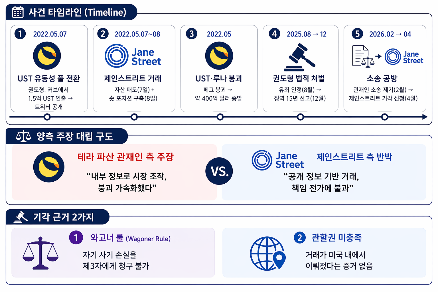 해당 사건은 테라폼랩스의 파산 관재인이 제기한 소송으로, 제인스트리트가 내부자 정보를 이용해 UST·루나 시장을 교란하고 붕괴를 촉발했다는 내용이 핵심이다.