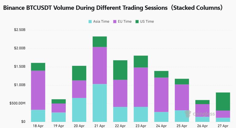 바이낸스 BTCUSDT 거래량은 아시아 시간대 1억1179만 달러, 유럽 시간대 1억9654만 달러, 미국 시간대 4억9136만 달러로 집계됐다.
