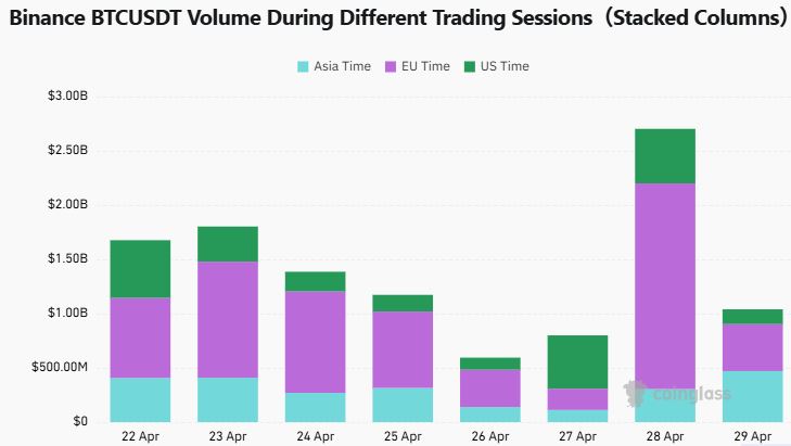 바이낸스 BTCUSDT 거래량은 아시아 시간대 4억7025만 달러, 유럽 시간대 4억3282만 달러, 미국 시간대 1억3661만 달러로 집계됐다.