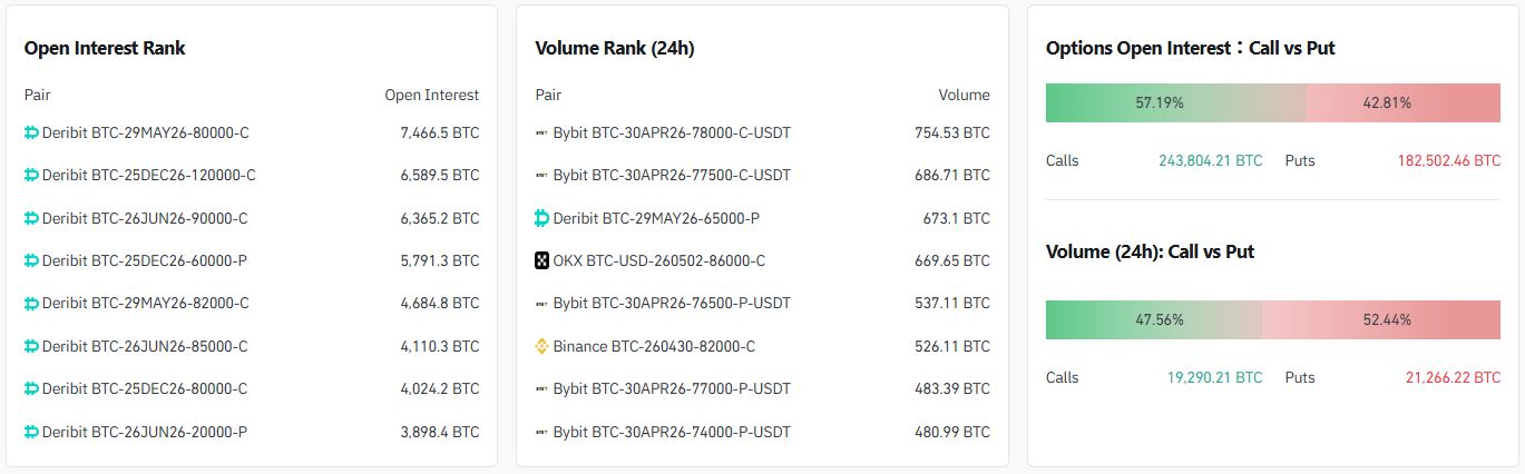 24시간 거래량 기준 상위 계약은 ▲7만8000달러 콜옵션(4월 30일·바이비트) ▲7만7500달러 콜옵션(4월 30일·바이비트) ▲6만5000달러 풋옵션(5월 29일·데리비트) 순으로 나타났다.