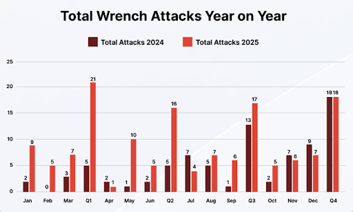 보고서에 따르면 2025년 전 세계에서 확인된 렌치 공격 사건은 총 72건으로, 2024년 대비 75% 증가했다. 렌치 공격은 폭력, 협박, 납치 등 물리적 수단을 통해 피해자로부터 개인 키나 비밀번호를 강제로 탈취하는 공격을 의미한다. 이러한 공격은 기술적 취약점에 의존하지 않으며, 암호화폐를 보유한 개인 자체를 직접적인 공격 대상으로 삼는다는 점에서 위험성이 더욱 크다고 보고서는 설명했다.