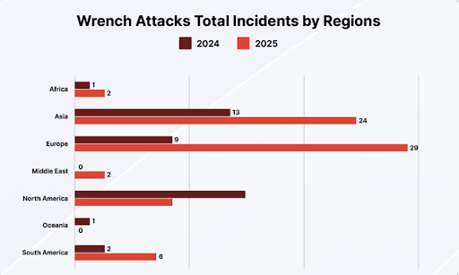 지리적 분포 측면에서는 유럽이 사상 처음으로 전 세계에서 가장 높은 위험 지역으로 부상했다. 2025년 기준 유럽은 전 세계 확인된 렌치 공격 사건의 40% 이상을 차지했으며, 이 가운데 프랑스는 기록된 공격 건수에서 미국을 넘어 전 세계 1위를 기록했다. CertiK은 이러한 변화가 북미 지역의 위험이 사라졌음을 의미하는 것은 아니며, 오히려 해당 범죄 유형이 사법 환경이 복잡하고 국경 간 공조 비용이 높은 지역으로 확산되고 있음을 보여주는 신호라고 분석했다.