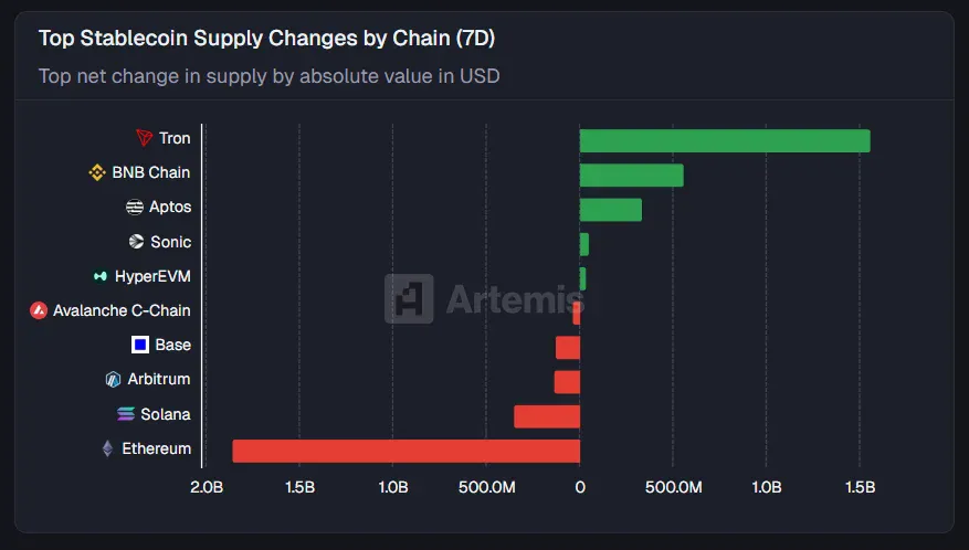 스테이블코인 공급이 가장 많이 증가한 블록체인은 트론이다. 약 16억 달러 규모의 공급 증가가 있었다.