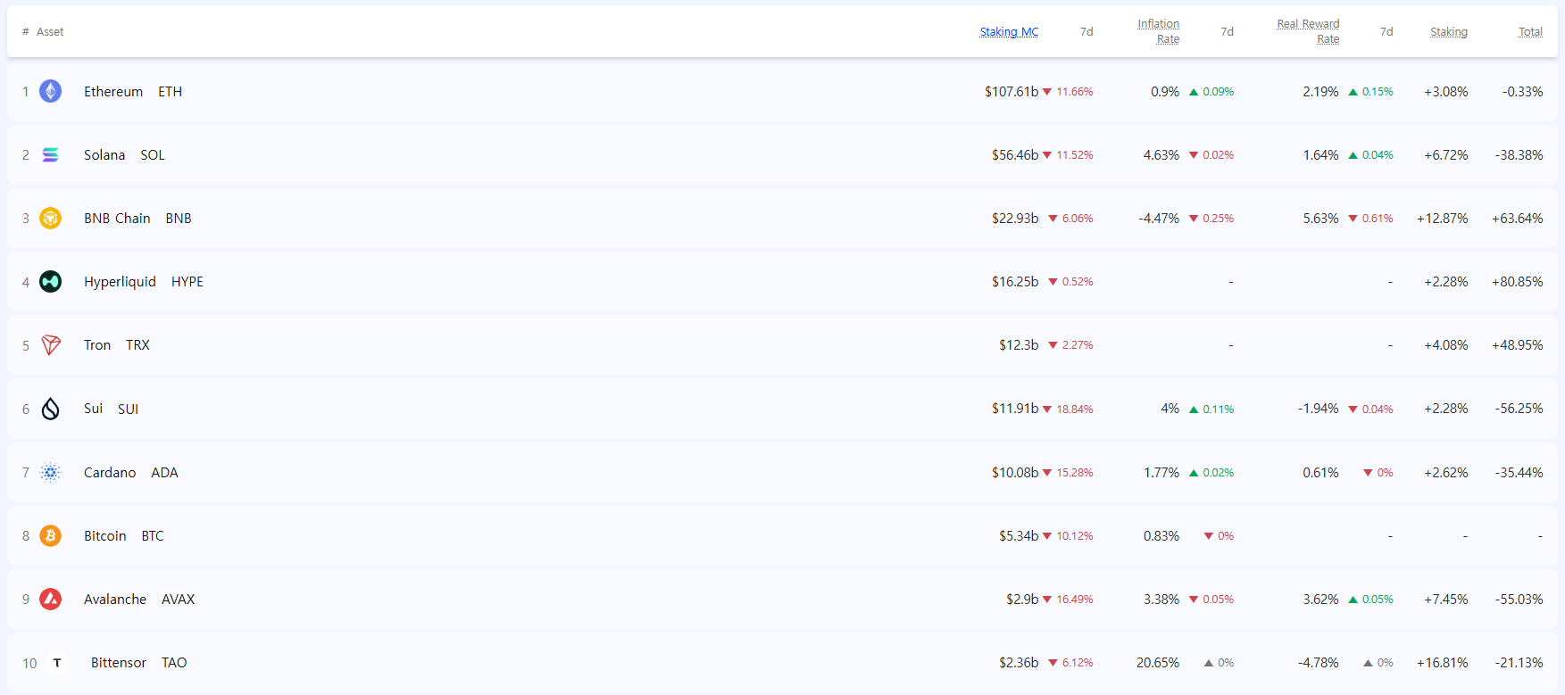 주요 스테이킹 체인들의 시가총액이 전반적으로 급감한 가운데 순위 변동과 보상률 격차가 동시에 확대되며 스테이킹 시장의 판도가 크게 흔들리고 있다.
