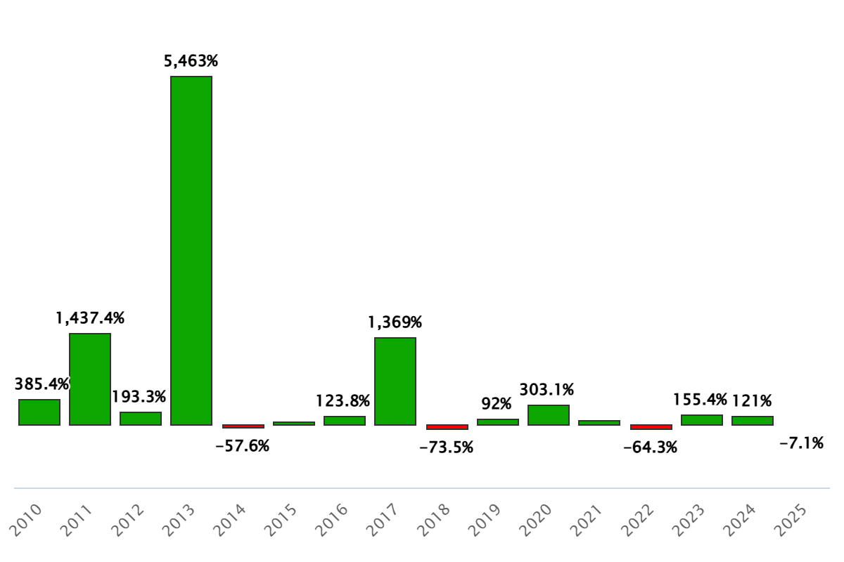 스탯뮤즈에 따르면 비트코인의 연초 대비 수익률은 -7.1%로, 전주 -1.4%% 대비 크게 하락했다. 최근 3년간 연간 수익률은 ▲2022년 -64.3% ▲2023년 155.4% ▲2024년 121%이다.