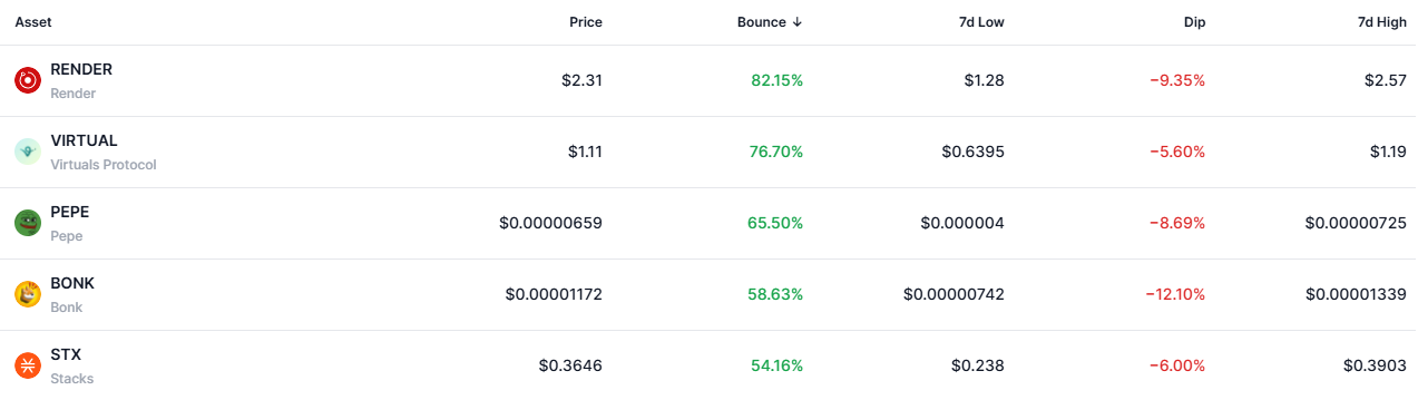 [편집자주] 급락 이후의 되돌림 흐름은 단기 매수세 유입 여부를 가늠하는 하나의 힌트가 될 수 있다. '저점(Dip)'은 최근 7일 최저가를, '반등(Bounce)'은 해당 저점 대비 상승률을 뜻한다. 이를 통해 기술적 반등 흐름과 시장의 수요 반응을 함께 살펴볼 수 있다. 조정 구간 이후 가격이 눈에 띄게 회복된 종목은 다음 추세 전환 가능성을 시사할 수도 있다. 반복적으로 나타나는 가격 패턴을 바탕으로 반등 흐름이 감지되는 자산을 소개한다.