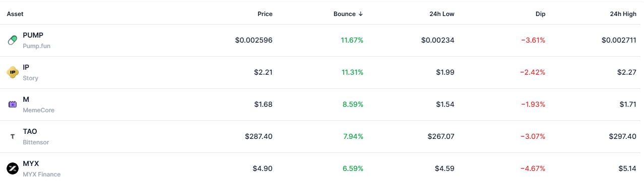 하루 동안 가장 큰 반등률을 기록한 자산은 펌프(PUMP)로, 일중 저점 0.00234달러에서 약 11.67% 상승해 0.002596달러까지 회복했다.