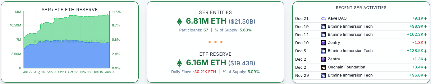전략자산(SER) 보유 물량은 681만 ETH(약 215억 달러)로, 전체 이더리움 공급량의 5.63%를 차지했다.