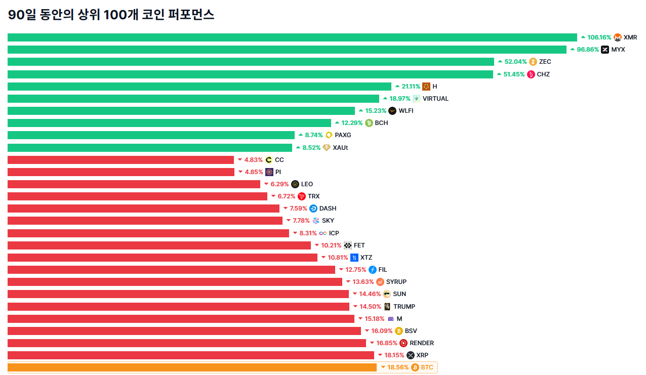 13일 오후 6시 4분 기준 비트코인은 전일 대비 1.91% 상승한 9만2135달러에 거래됐다. 90일 누적 수익률은 -18.56%를 가리키고 있다.