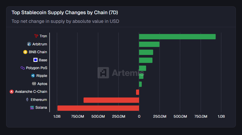 최근 7일간 스테이블코인 자금은 중앙화 거래소와 트론·아비트럼으로 몰린 반면, 이더리움·솔라나·USDT에서는 뚜렷한 유출이 나타나며 유동성 재배치가 가속화됐다.