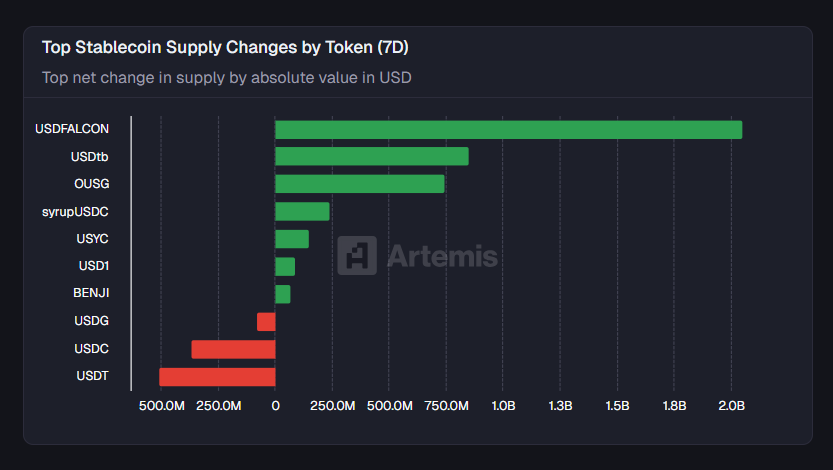 한 주간 스테이블코인 가운데 가장 큰 공급 증가를 기록한 자산은 USDFALCON로, 총 20억 달러 규모의 순증이 확인됐다.