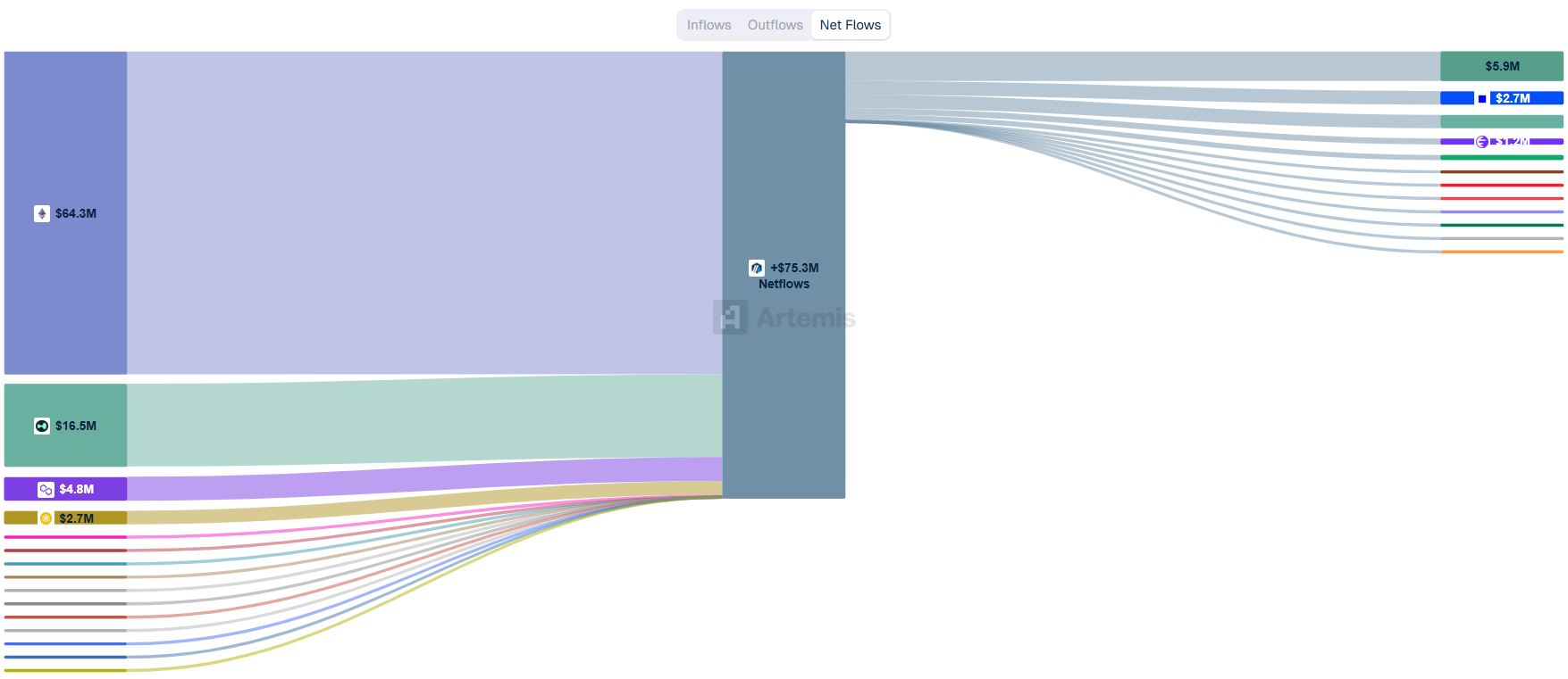 가장 많은 자금 유출이 발생한 체인은 아비트럼으로, 총 7억3328만 달러가 빠져나갔다.