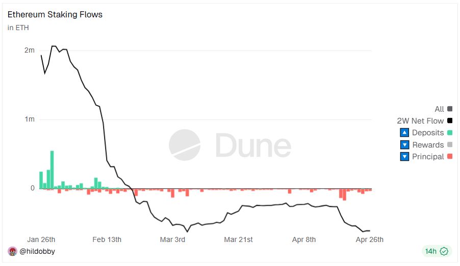같은 기간 보상 출금은 총 1만4745 ETH, 원금 출금은 총 25만539 ETH로 집계돼 출금 우위 흐름이 뚜렷하게 나타났다. 특히 4월 24일 6만8952 ETH, 4월 23일 4만8640 ETH가 출금되며 원금 출금이 집중됐다.