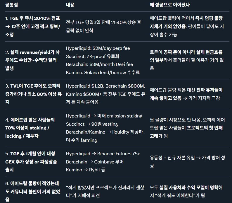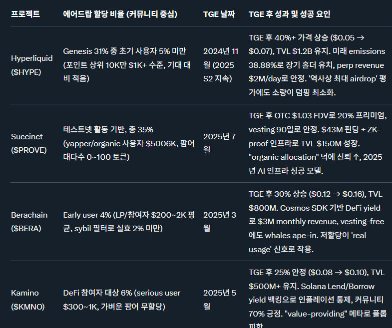 위 리스트는 에어드랍 할당을 적게 지급했고 TGE 이후 긍정적인 가격을 유지했었던 프로젝트 리스트