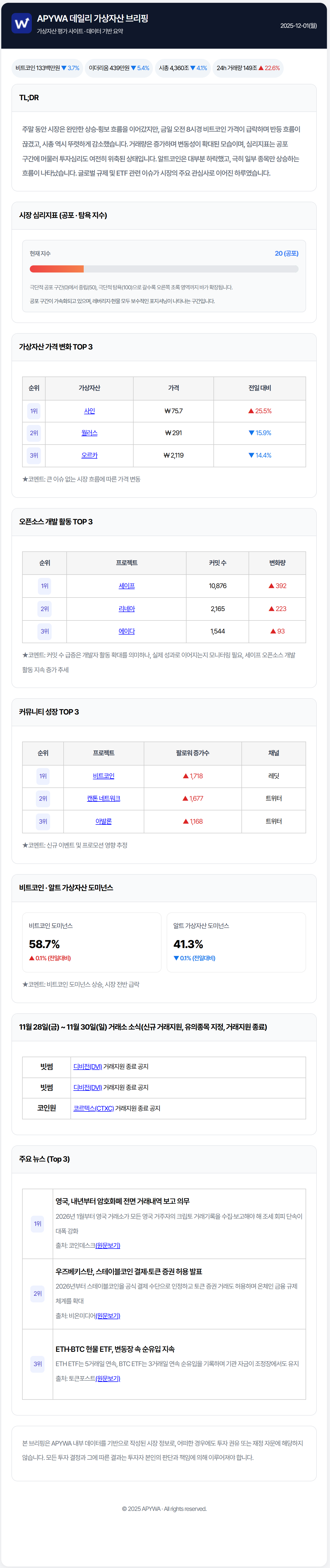주말 동안 시장은 완만한 상승·횡보 흐름을 이어갔지만, 금일 오전 8시경 비트코인 가격이 급락하며 반등 흐름이 끊겼고, 시총 역시 뚜렷하게 감소했습니다. 거래량은 증가하며 변동성이 확대된 모습이며, 심리지표는 공포 구간에 머물러 투자심리도 여전히 위축된 상태입니다. 알트코인은 대부분 하락했고, 극히 일부 종목만 상승하는 흐름이 나타났습니다. 글로벌 규제 및 ETF 관련 이슈가 시장의 주요 관심사로 이어진 하루였습니다.