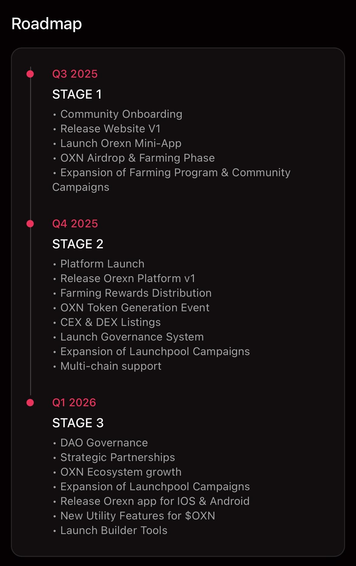 Orexn의 공식 로드맵에 따르면, OXN은 2025년 4분기(Q4 2025) 에 “토큰 생성 이벤트(TGE) + CEX & DEX 상장”이 계획되어 있습니다.