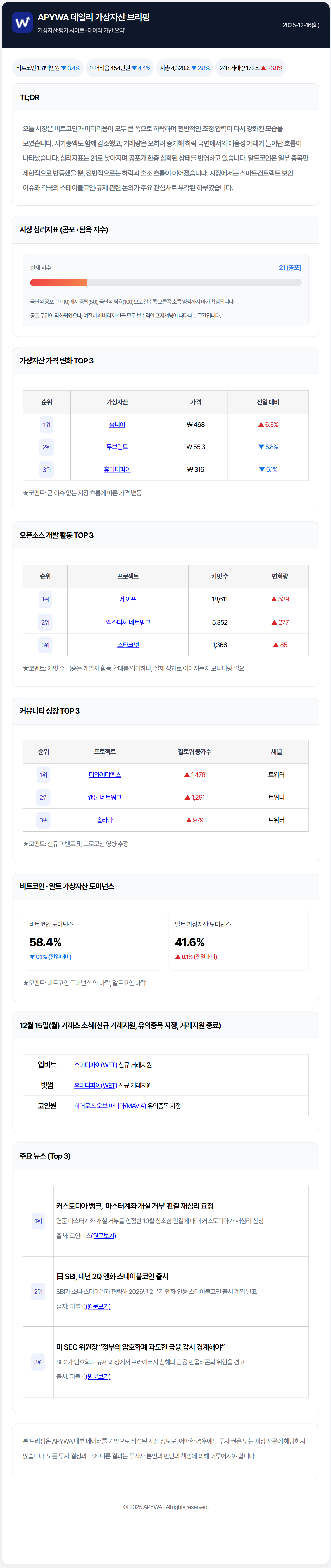 - 오늘 시장은 비트코인과 이더리움이 모두 큰 폭으로 하락하며 전반적인 조정 압력이 다시 강화된 모습을 보였습니다. 시가총액도 함께 감소했고, 거래량은 오히려 증가해 하락 국면에서의 대응성 거래가 늘어난 흐름이 나타났습니다. 심리지표는 21로 낮아지며 공포가 한층 심화된 상태를 반영하고 있습니다. 알트코인은 일부 종목만 제한적으로 반등했을 뿐, 전반적으로는 하락과 혼조 흐름이 이어졌습니다. 시장에서는 스마트컨트랙트 보안 이슈와 각국의 스테이블코인·규제 관련 논의가 주요 관심사로 부각된 하루였습니다.