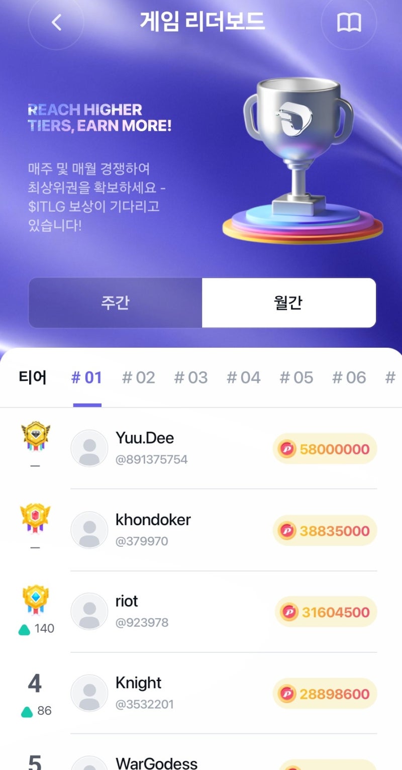 7개의 게임 통합점수로 티어가 1~6 티어까지 ITLG 코인을 차등보상 받으실수 있습니다.
