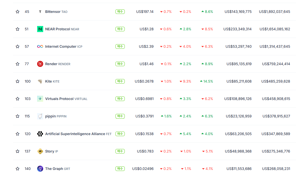 현재 주요 AI 코인으로는 비텐서, 니어프로토콜, 인터넷컴퓨터, 렌더, 카이트, 버추얼스 프로토콜, 피핀, 인공지능 초지능 얼라이언스, 스토리, 더그래프 등이 꼽히네요