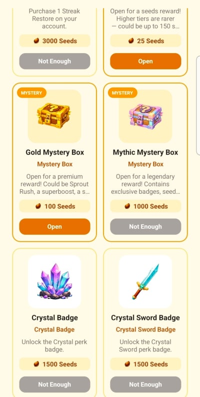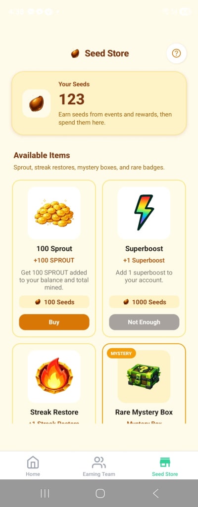 앱내에서 Seed를모아 코인채굴 부스터를 구매할수 있습니다 Seed는 미션 수행및 구매로 얻으실수 있습니다.