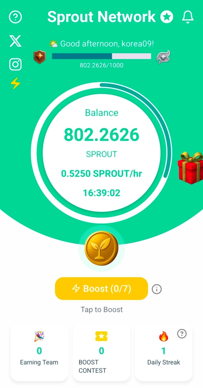 한 번 탭으로 채굴 (One-Tap Mining): 앱에서 하루에 한 번 버튼만 누르면 24시간 동안 자동으로 SPROUT을 벌어요. 앱을 켜두지 않아도 되고, 배터리나 데이터 거의 안 먹어요.