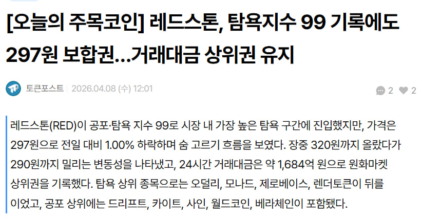토큰포스트는 금일 오늘의 주목코인으로 레드스톤은 언급하며 탐욕 상위 및 공포 상위 코인을 전해왔다.