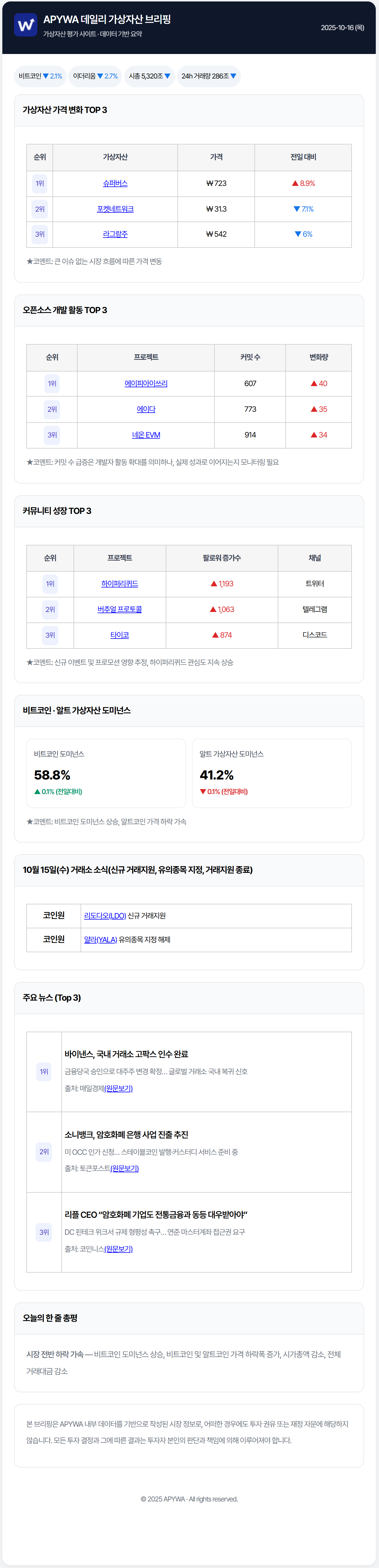 [10.16 코인 브리핑] 가상자산 시장 약세 심화, 전반적인 시장 지표 하락
