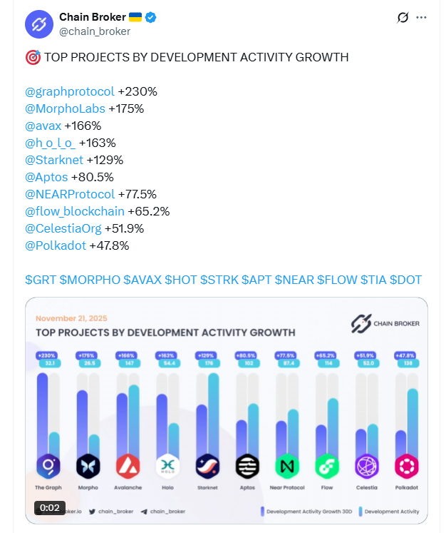 이번 순위는 가격이 아닌 개발 활동량 기준 지표로, 각 프로젝트의 기술적 진전 상황을 확인하는 데 의미 있는 자료입니다.