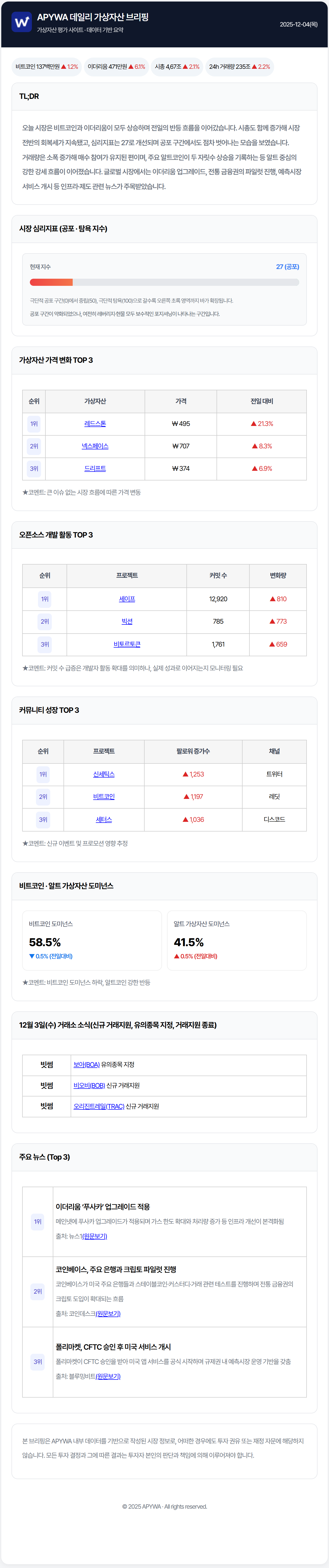 오늘 시장은 비트코인과 이더리움이 모두 상승하며 전일의 반등 흐름을 이어갔습니다. 시총도 함께 증가해 시장 전반의 회복세가 지속됐고, 심리지표는 27로 개선되며 공포 구간에서도 점차 벗어나는 모습을 보였습니다. 거래량은 소폭 증가해 매수 참여가 유지된 편이며, 주요 알트코인이 두 자릿수 상승을 기록하는 등 알트 중심의 강한 강세 흐름이 이어졌습니다. 글로벌 시장에서는 이더리움 업그레이드, 전통 금융권의 파일럿 진행, 예측시장 서비스 개시 등 인프라·제도 관련 뉴스가 주목받았습니다.