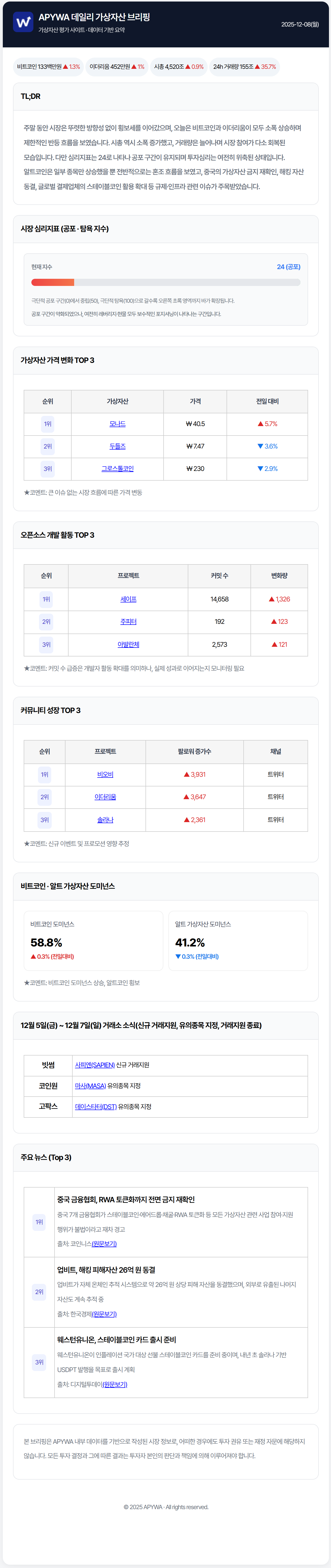 주말 동안 시장은 뚜렷한 방향성 없이 횡보세를 이어갔으며, 오늘은 비트코인과 이더리움이 모두 소폭 상승하며 제한적인 반등 흐름을 보였습니다. 시총 역시 소폭 증가했고, 거래량은 늘어나며 시장 참여가 다소 회복된 모습입니다. 다만 심리지표는 24로 나타나 공포 구간이 유지되며 투자심리는 여전히 위축된 상태입니다. 알트코인은 일부 종목만 상승했을 뿐 전반적으로는 혼조 흐름을 보였고, 중국의 가상자산 금지 재확인, 해킹 자산 동결, 글로벌 결제업체의 스테이블코인 활용 확대 등 규제·인프라 관련 이슈가 주목받았습니다.