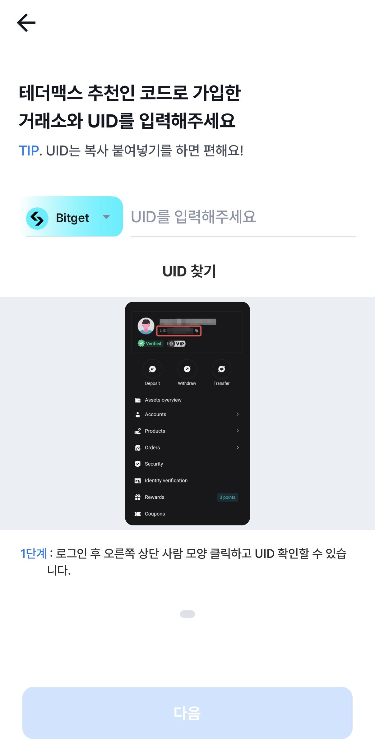 1. 비트겟 거래소 앱을 키시면 왼쪽바로상단위에 사람 모양을 눌러주세요! 그럼 자기프로필이 뜰텐데 바로옆에 UID :000000이라고 숫자가 뜰텐데 그걸 복사해주세요. (비트겟 가입후 KYC인증완료 한 후 연동하셔야 합니다!!)