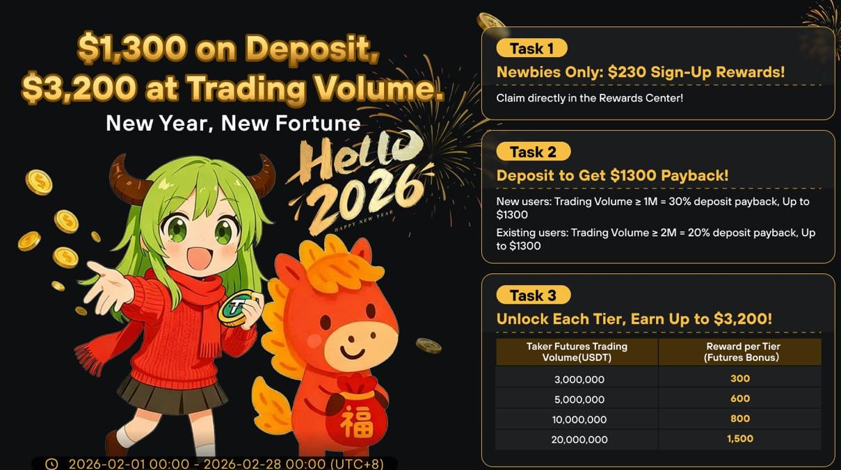 โซ๏ธ[New Users]: Receive a 30% bonus up to $1,300 upon depositing 100 USDT or more and reaching 1M futures trading volume. โซ๏ธ[Existing Users]: Receive a 20% bonus up to $1,300 upon depositing 100 USDT or more and reaching 2M futures trading volume.