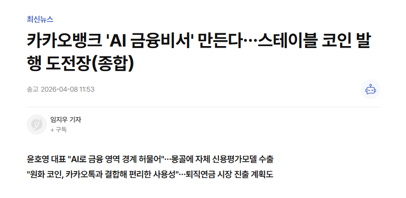 어제도 카카오뱅크에서 스테이블코인 관련 소식이 있었더라고?