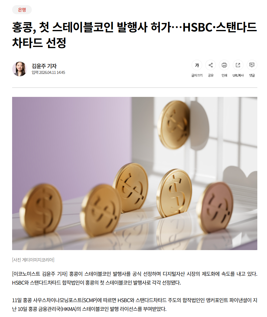 기사는 홍콩에서도 스테이블코인 발행사를 공식 선정했다는 소식인데