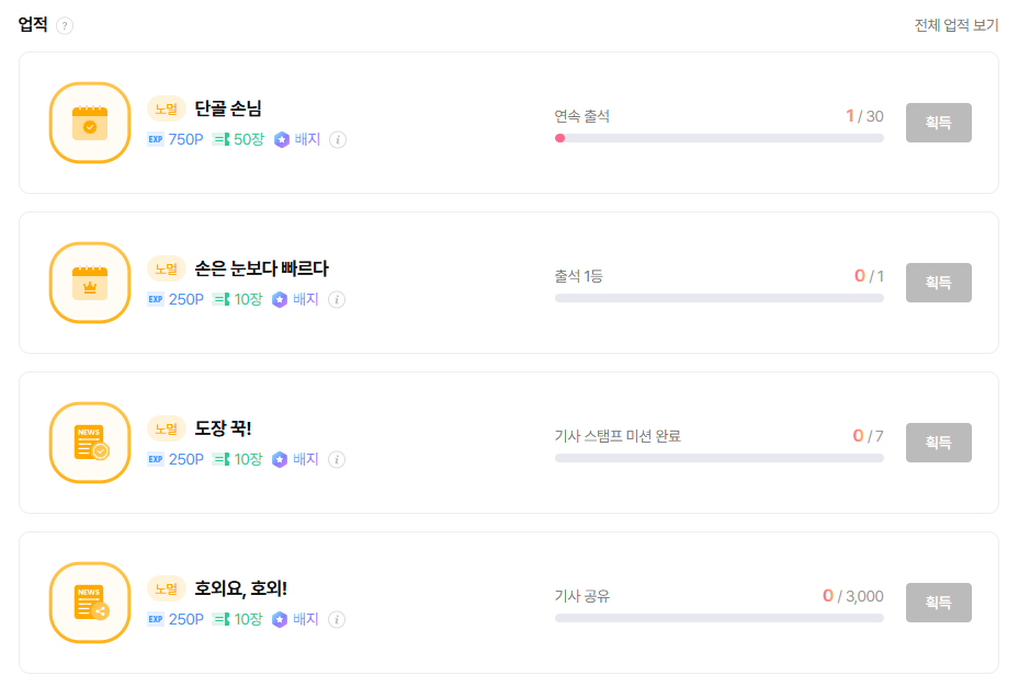 (이 외에도 공유, 좋아요 등 다양한 활동 분야에 업적이 준비될 예정입니다.)