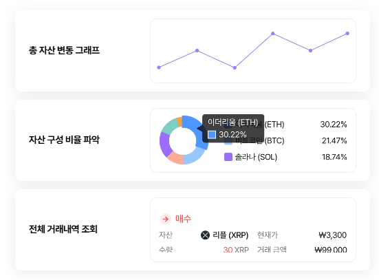 • 기능: 거래소별 자산 비중, 코인별 구성 비율, 개별 수익률 등을 직관적인 파이 차트와 그래프로 시각화해 줍니다.