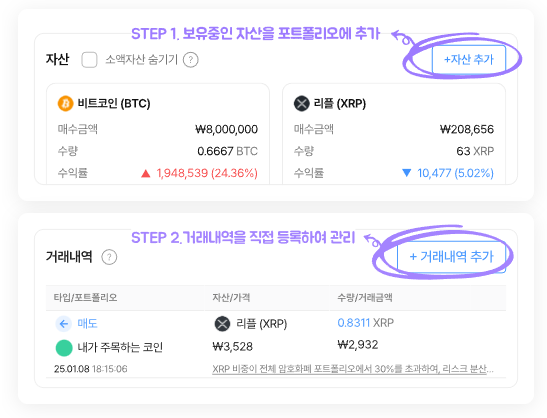 • 기능: 거래소 API 키만 등록하면, 보유 중인 코인 종류, 수량, 평가 금액, 수익률이 실시간으로 자동 업데이트됩니다.