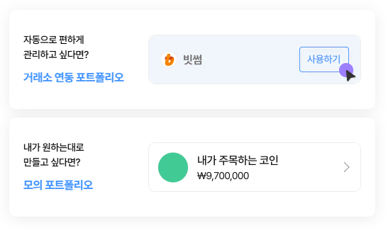 • 자산 연동: [포트폴리오] > [거래소 연동] 메뉴에서 사용 중인 거래소의 API Key를 입력합니다. (읽기 전용 권한 권장)