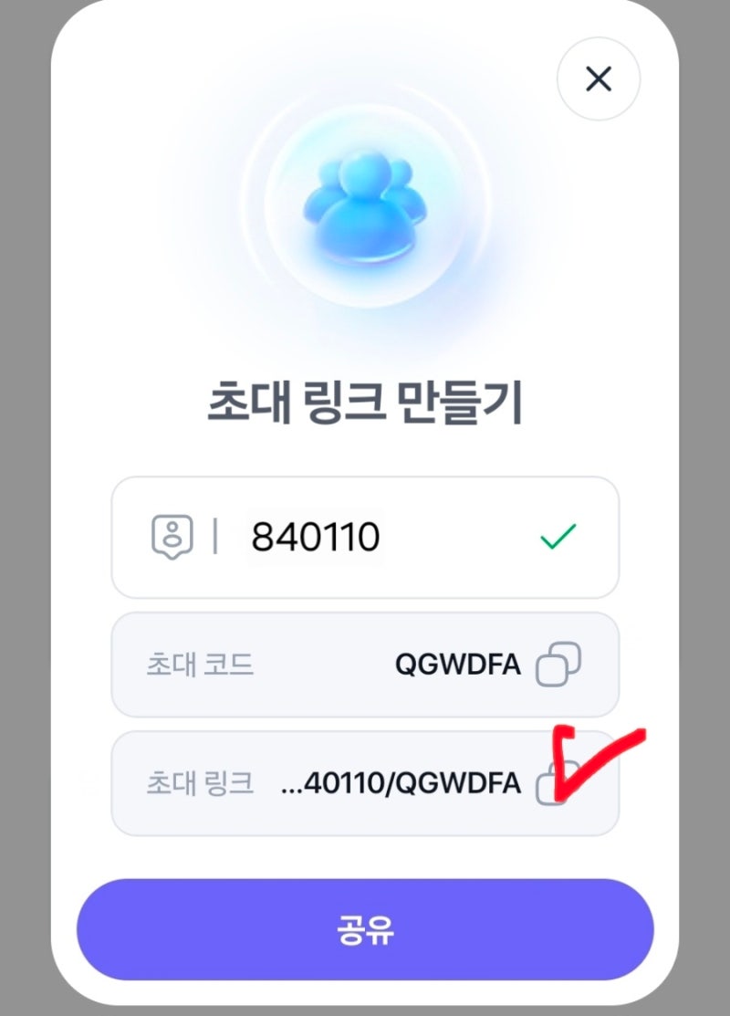 안전그룹 초대할사람의 아이디가 840110 이면 밑에 초대링크가 생성이됩니다.